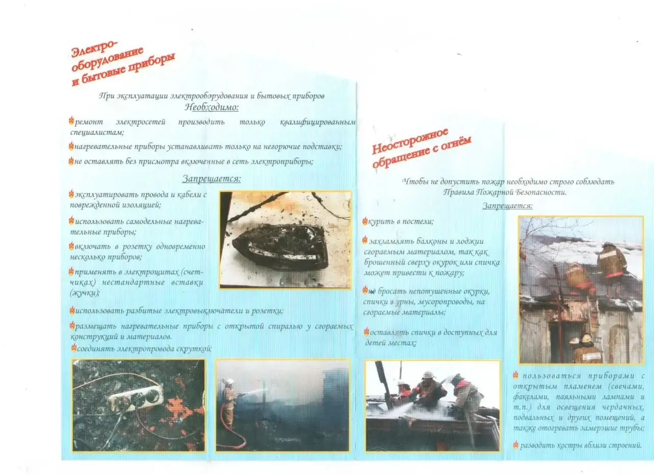 Обеспечьте всестороннюю защиту вашего жилья от огненной беды. Проверьте электрооборудование и электроприборы, проверьте печь, обратите внимание на состояние электропроводки в вашем жилье. Не перегружайте бытовые электросети, не подключайте несколько приборов к одной розетке. Соблюдайте все требования пожарной безопасности при монтаже и эксплуатации электрооборудования. Не оставляйте без должного присмотра маленьких детей.